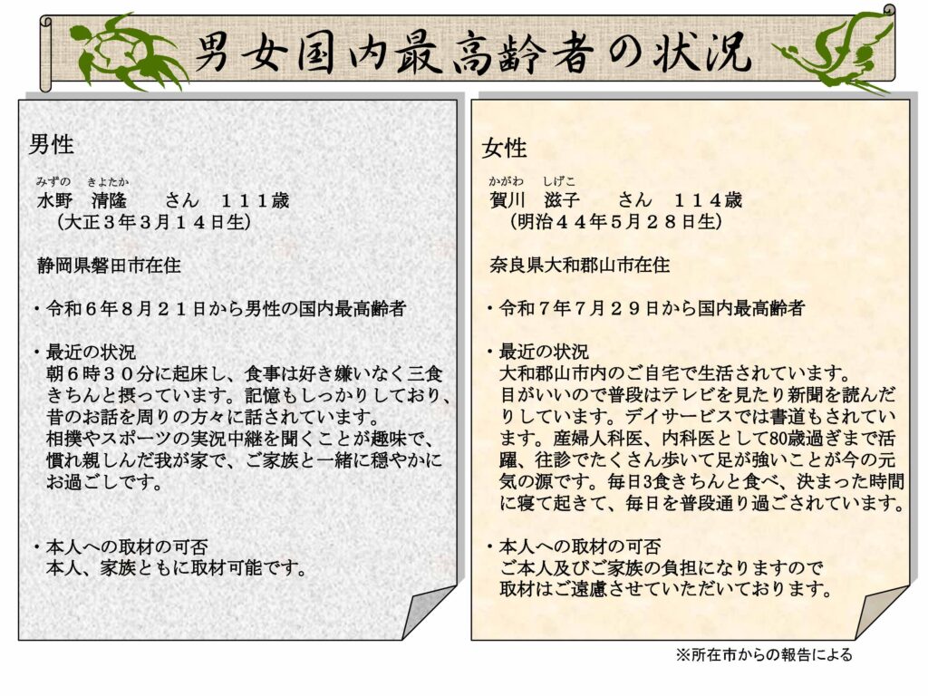 最高齢は、地元奈良県にお住まいの 114歳の女性だそうで、大変喜ばしい限りです。