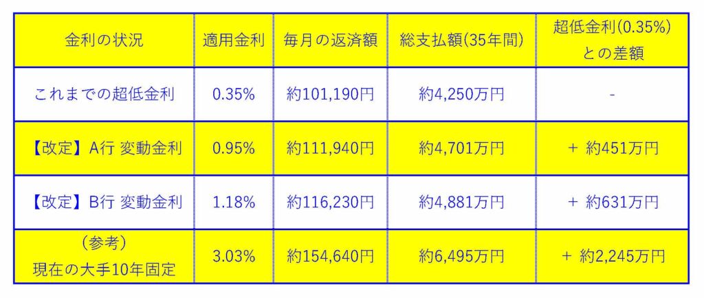 「0.35%」というかつての超低金利で借りた場合と、今回の引き上げ後の金利とで、返済額をシミュレーションしてみました。